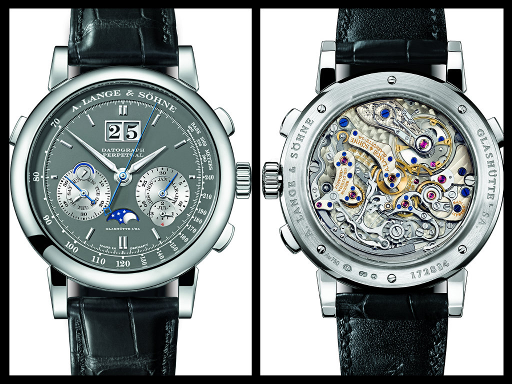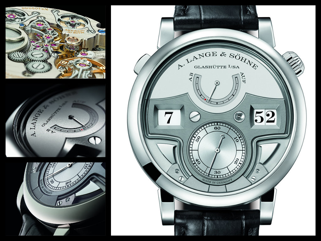 Lo ZeitWerk Ripetizione Minuti è stato dedicato al 200° anniversario della nascita di Adolphe Lange, fondatore della Marca sassone, e ha surclassato tutte le altre novità. Sotto il profilo tecnico invece delle tradizionali lancette il suono dipende da un anello delle ore e da due dischi delle unità dei minuti; quando funziona la suoneria non si può estrarre la corona; attivandola il ruotismo di carica viene separato dal rocchetto che la aziona e si evita dispendio di energia; se la riserva di carica (indicata a ore 12) è inferiore alle 12 ore l’ascolto viene bloccato; interessante vedere i martelletti in azione sul lato inferiore del quadrante. Per chi non è esperto sicuramente è difficile da immaginare queste indicazioni, ma il risultato è sorprendente. Protetto da brevetti il Calibro di Manifattura L043.5 a carica manuale, è composto da 771 elementi, 93 rubini; ha 18.000 A/h, il bilanciere eccentrico, una riserva di carica 36 ore se la suoneria non è stata attivata ed è custodito (almeno per ora) solo in una cassa in platino ø 42,2 mm.