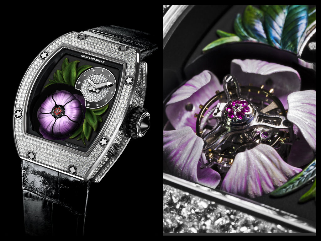 Del nuovo RM-19-02 T0urbillon Fleur, o Flower, che ha fatto entrare un Richard Mille nel romantico mondo floreale, abbiamo già scritto venerdì nella cronaca del Salone e anche dopo aver visto tutte le 16 presentazoni lo riteniamo un orologio tecnicamente fantastico per la camelia, che si apre rivelando un tourbillon volant ben distante da ore e minuti.