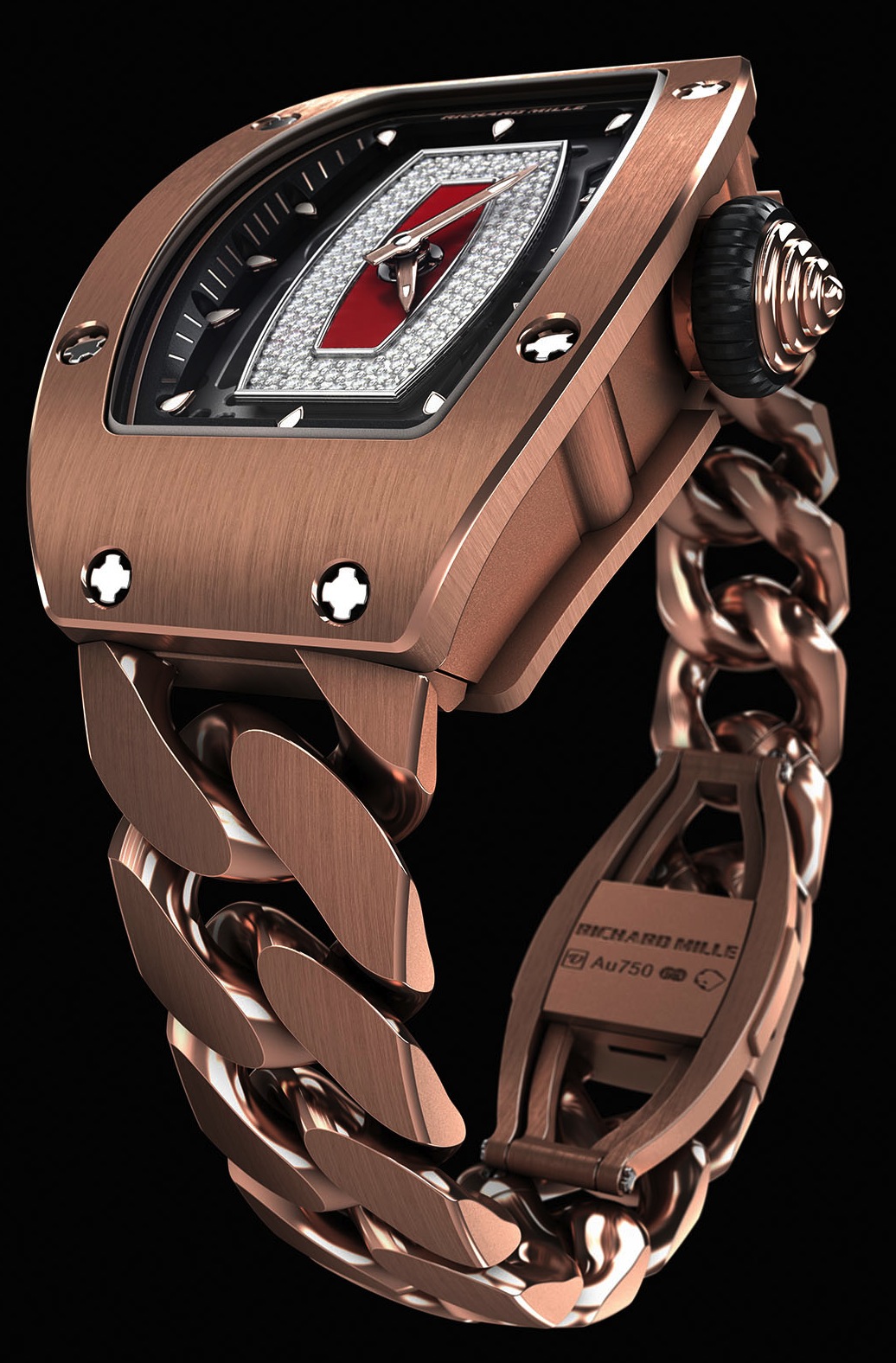 Infine risultati tecnici ottenuti anche nel bracciale Open Link, che si presenta con maglie in oro piatte aperte; integrato nella cassa è leggero e flessuoso. Il modello è destinato alle versioni RM 07-01 e RM 037, che sino ad ora potevano essere scelte solo con numerosi tipi di cinturino (pelle, raso, caucciù, alligatore, ecc.).