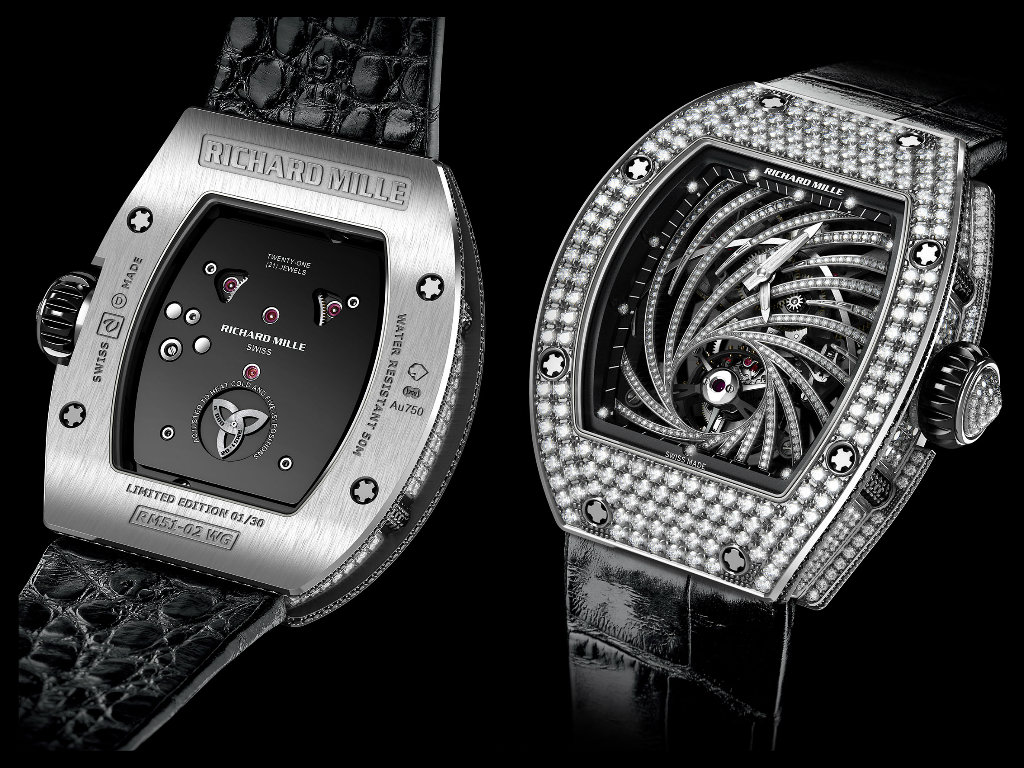 Ancora un modello prezioso, l’RM 51-02 Diamond Twister in oro bianco (mm 47,94×39,70 mm) con un artistico decoro in diamanti sul quadrante dove 270 brillanti si inseguono in volute che, come raggi di sole, partono dalla finestrella dove si vede la gabbia; brillanti sono incastonati anche sulla cassa e sulla corona. Il diametro del tourbillon è di mm 12,30 e 21.600 le A/h.