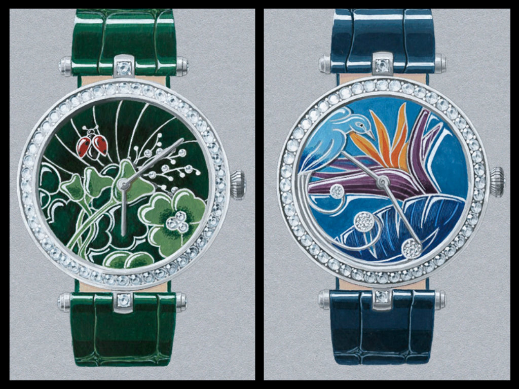 Nel campo dell’orologeria con modelli complicati quest’anno il Lady Arpeld Jour et Nuit, un automatico con modulo 24h realizzato in esclusiva per VC&A, è dedicato alla coccinella portafortuna, un altro agli uccelli paradiso; i quadranti di entrambi sono capolavori di incisione e smalti champlevés e cloisonnés in edizioni numerate; cassa in oro bianco e lunetta in diamanti.