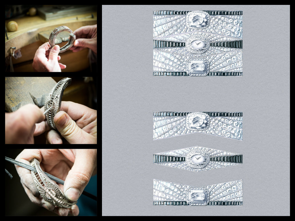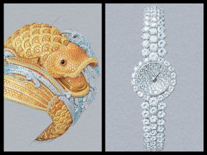 Infine l’alta gioielleria di cui pubblichiamo gli schizzi. Due sono i pezzi unici, l’orologio con movimento al quarzo che sul bracciale riproduce una carpa, in verità un modello che ci sembra più che barocco, e poi un diluvio di diamanti nell’Abstraction, composizione geometrica di diamanti per decine di carati e spinelli, che provengono da un lotto acquistato nel 1925. Ispirato al leggendario ballo Black&White dato a New York nel 1966 da Truman Capote, vede tre bracciali che si portano uniti o singolarmente, nell’orologio con quadrante in madreperla il movimento è il celebre JLC Calibro 101). Infine non è un pezzo unico, ma visto il numero dei diamanti e la cassa in platino, ø 20 mm, difficile classificarlo come edizione illimitata, il modello “à cheval” che non è dedicato agli amanti dell’equitazione, ma si riferisce alle gemme che si accavallano creando particolari volumi, alle anse e alla chiusura del bracciale a forma di ferro di cavallo, da sempre ritenuto portafortuna.