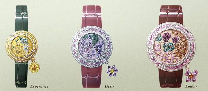 In quanto ai Charms, da quelli più semplici ai più preziosi difficile fare una scelta dopo aver ammirato i quadranti che riproducono fiori in smalti o con miniature. Casse ≠ mm 25, 32 e 38 rispettivamente per il Boutons d’or (Extraordinary Esperance), ai lillà (Extraordinaire Désir) manca solo il profumo, i ciclamini sono uno splendore (Extraordinaire Amour)