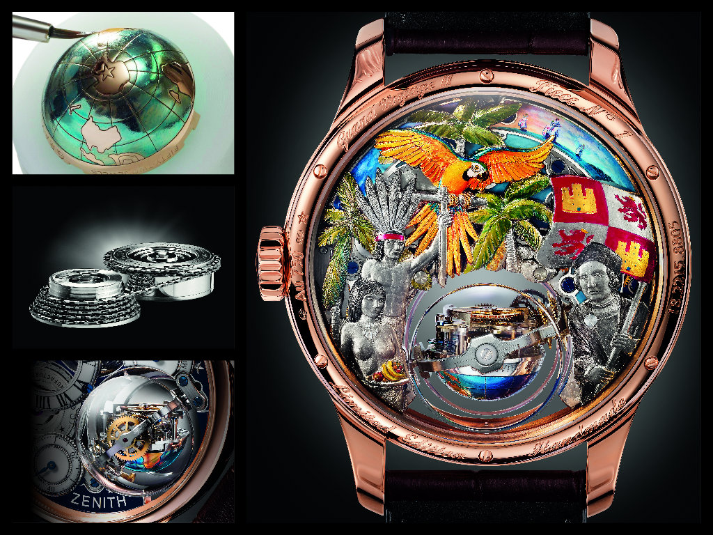 Anche nella sua prima versione del 2013 era un orologio importante, ma questo lo sopravvanza. Nella cassa in oro rosa ø 45 mm custodisce, come il primo, il movimento Calibro 8805 El Primero a carica manuale con modulo per la trasmissione a catena (questa, unita al bariletto, garantisce una forza costante) inoltre il sistema gravity control (un sistema giroscopico) mantiene l’organo regolatore sempre orizzontale, infine le 36.000 A/h che resero famoso El Primero sin dal 1969 garantiscono la precisione. Queste tre soluzioni innovative, testate dai Maestri di Le Locle, sono visibili dal quadrante traforato. La decorazione a micropittura sul retro dell’orologio rende ancora più incredibile questo cronografo che, secondo noi, potrebbe benissimo essere indossato al contrario tanto è bello e pieno di riferimenti il dipinto, con smalti cloisonnées, che riproduce l’ambiente dell’America Centrale, Cristoforo Colombo sulla destra e gli abitanti locali a sinistra.