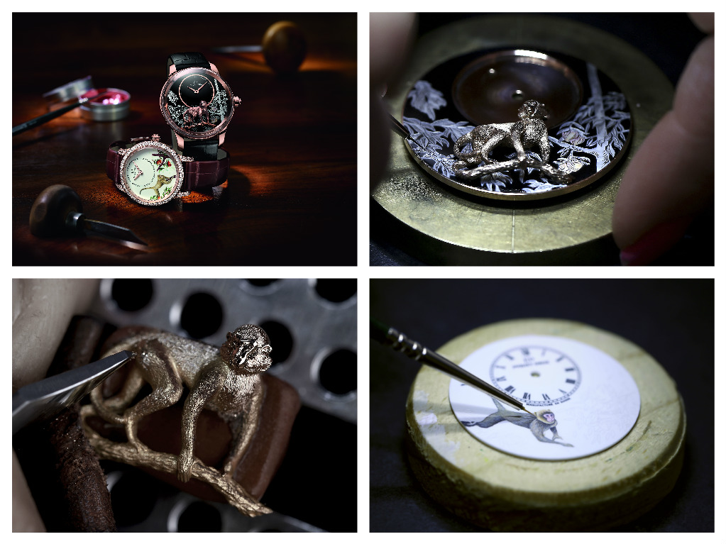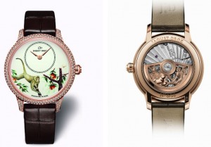 After four Brands with watches with Monkeys on the dials, we are publishing here the fifth by Jaquet Droz, a self winding in red or white gold with enameled dial or with gold relief sculptures.