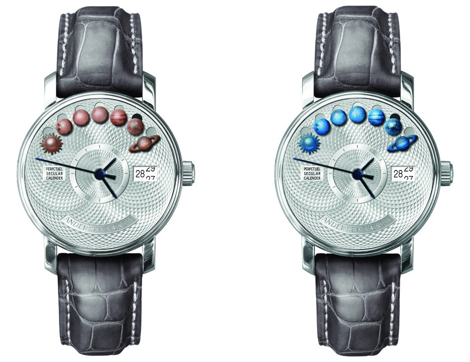 La scelta del materiale e del colore di questa ulteriore complicazione con il sole che indica la domenica e la luna il lunedì, è lasciata ai futuri proprietari così da creare dei pezzi unici fra i 20 esemplari previsti. Forse è anche necessario aprire una parentesi ricordando che, secondo il calendario gregoriano, lo scarto fra tempo reale e tempo civile viene recuperato ogni 4 anni con il 29 febbraio, salvo negli anni secolari 1700, 1800, 1900, 2100, 2200 e 2300 (cifre non divisibili per 4) in cui febbraio ha 28 giorni e quindi il movimento automatico va regolato manualmente. Il movimento ideato da Andersen elimina questa necessità.