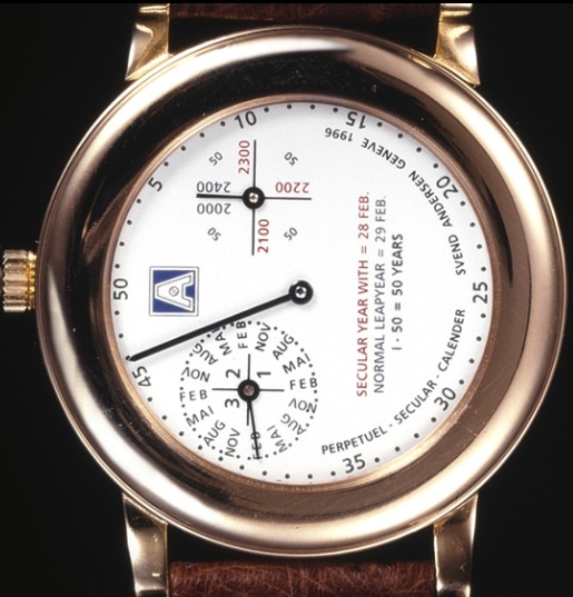 Sven Andersen è un Maitre Horloger che tutti gli appassionati conoscono e che insieme a Vincent Calabrese ha fondato l’Accademia degli orologiai indipendenti. Nel 1996 ha realizzato un Perpetual Secolar Calendar al quale, nell’anniversario dei vent’anni, ha aggiunto il modulo dei giorni della settimana con sole, luna e 5 pianeti.