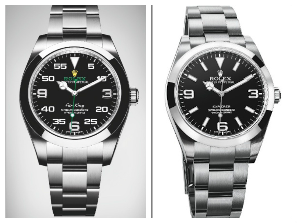 Ci è piaciuto l’Oyster Perpetual Air King in acciaio 904L, ø 40 mm, anche se qualcuno ne criticava le cifre dei minuti che spiccano sul quadrante nero. I caratteri del nome sono quelli del modello che negli anni ’30 fu al polso degli aviatori della spedizione Houston che sorvolò l’Everest e nel volo Londra-Melbourne-London sul bimotore De Havilland Comet; in verde la Marca e la lancetta dei secondi, quelle di ore e minuti sono in oro bianco. Il movimento è il Calibro 3131 con rotore perpetual, 28.800 A/h, 31 rubini, spirale Parachrome blu paramagnetica con curva Rolex, bilanciere a inerzia variabile, ponte del bilanciere passante, ruota d’ancora paramagnetica in nichel fosforo. Bracciale Oyster con chiusura pieghevole Oysterclasp e maglia rapida Easylink che consente un allungo di 5 mm. L’Oyster Perpetual Explorer 40 in acciaio 904L e con lunetta liscia ha il quadrante nero con indici e lancette in oro bianco Chronolight ad alta visibilità; il Calibro 3132 sviluppato e realizzato in house, con autonomia di circa 48 ore, ha il dispositivo antiurto Paraflex.