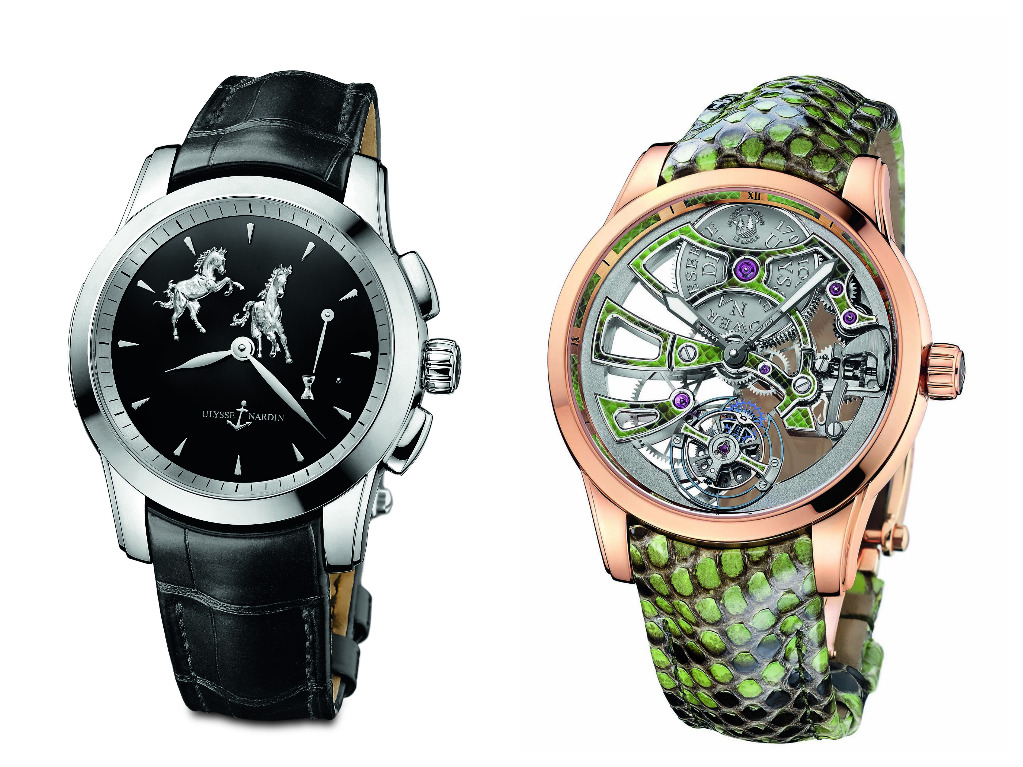 Sono solo 18 gli esemplari del primo, con il tourbillon volant; spirale; ancora e ruota scappamento sono in silicio, i ponti dipinti a mano incastonano i rubini, il movimento è il Calibro di Manifatur UN 170 a carica manuale, autonomia di circa 170 h; A/h 18000; il cinturino è in pitone. Edizione limitata a 28 esemplari per l’Hoursstirker Horse, orologio automatico con Calibro di Manifattura UN 610 e suoneria al passaggio che fa ascoltare le ore e le mezze ore grazie a un sistema di attivazione automatico. Sul quadrante in onice nera due jacquemarts in oro, ogni volta che il martello colpisce il gong i cavalli si muovono come in una danza. In oro o platino la cassa ha un diametro di 43 mm.