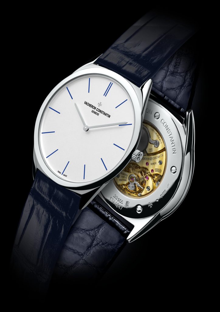 Gli eleganti ultrapiatti che hanno visto gli exploits di Piaget, Jaeger-LeCoultre e Vacheron Constantin, sono tornati di moda, quasi un controaltare dei massicci orologi sportivi. Il movimento a carica manuale Calibro 1003 dell”Ultrathin 1955 ha uno spessore di mm 1,64, è inserito in una cassa in platino ø 36 mm e lo spessore totale dell’orologio arriva a 4,13 mm. Dal fondo in vetro zaffiro si ammira la decorazione del movimento con ponti e platina in oro 18 carati, tanto che c’è da domandarsi se non sarebbe altrettanto bello indossarlo come un double face. Il quadrante è opaline.