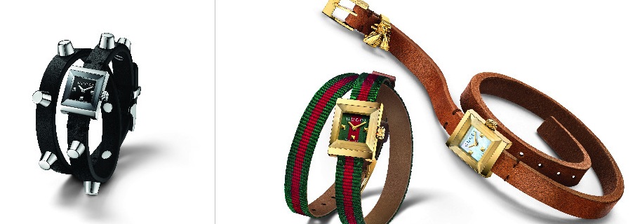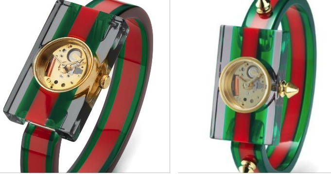Al polso delle modelle sotto maniche fiorite o con disegni optical nei colori rosso/verde della Casa, occhieggiavano i segnatempo ideati dal nuovo gruppo creativo guidato da Alessandro Michele, che non ha deluso i fans del Gruppo. Particolarmente indovinata la nuova collezione GRG (Green-red-green) con i colori iconici del Marchio cassa in acetato 40 x 24mm con web verde-rosso-verde (colori iconici di GG), quadrante scheletrato color oro, movimento al quarzo svizzero, bracciale bangle in acetato verde-rosso-verde con borchie in PVD oro giallo. Riprendendo un motivo storico della Maison, sul retro della cassa è inciso un motivo ape.
