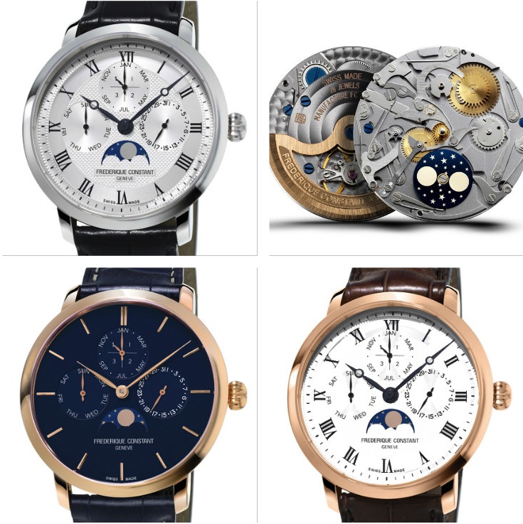 Ecco le caratteristiche di questo Q.P. con fsi di luna e quadriennio, ideato e realizzato in house dopo due anni di sviluppo e ricerca, sotto la direzione di Manuel Da Silva Matos, responsabile del Dipartimento R&S e di Pim Koeslag, responsabile tecnico di Frédérique Constant. Nel movimento automatico Cal.FC 775 lo spessore sottile (6,7 mm) è stato ottenuto grazie a innovazioni dei componenti, le A/h sono 28.600, i rubini 26; il movimento, che comprende 191 componenti, è realizzato a Plan-les-Ouates nello stabilimento FC con macchine CNC; la decorazione è a Perlage e Côtes de Genève circolari. i quadranti sono silver per la cassa in acciaio, e silver o blu navy per quella placcata oro rosa; gli indici sono applicati. Sulla cassa i correttori: a ore 5 il pulsante per far avanzare le fasi lunari, a ore 8 quello per il giorno della settimana e alle 10 quello per far avanzare giorno e data simultaneamente.