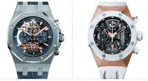 Al SIHH 2016 la passerella dei Royal Oak con scappamento a tourbillon è stata imponente, guidata da due squelette: un tourbillon cronografo in platino ø 44 mm calibro 2936 manuale, quadrante blu e un tourbillon extrapiatto ø 41 mm calibro 2924 carica manuale, quadrante grigio ardesia, per arrivare a un extrapiatto anche con diamanti, entrambi in platino ø 41 mm e quadranti grigio fumé. A queste versioni aggiungiamo il Royal Oak Concept, cronografo tourbillon ø 44 mm in oro rosa e ceramica calibro 2941 a carica manuale e il Royal Oak Offshore tourbillon cronografo automatico calibro 2897 ø 44 mm.