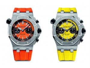 Completiamo questa lunga rassegna (ma saremmo stati in imbarazzo scegliendo un numero minore di modelli) con i coloratissimi cronografi Royal Oak Offshore Diver (giallo, arancione, blu, verde) disponibili solo nelle boutiques della Marca; realizzati per un pubblico di sportivi che amano le immersioni, hanno la cassa in acciaio ø mm 42 sub a 300 metri con valvola per il gas elio e movimento automatico calibro 3124/3841, cinturini in caucciù in colore coordinato a quello del quadrante.