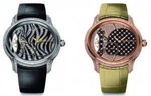 La collezione Millenary, nata nel 1996 e che ha visto anche versioni dedicate alla Maserati, anche quest’anno si è dedicata agli orologi gioiello mantenendo la forma ovalizzata della cassa e la posizione decentrata per il quadrante e l’organo regolatore. In più designer e tecnici hanno interpretato diamanti, perle e onice per ottenere decorazioni ipnotiche o che tramutano i quadranti in preziosi e lucenti tessuti trapuntati. Le due versioni con cassa in oro bianco o rosa, sono equipaggiate con il Calibro manuale 5205 o 5206, A/h 21.600, spessore di 5,64 mm nel primo e 5,94 mm nel secondo. Da Audemars Piguet il savoir faire orologiero si affianca anche a quello dell’alta gioielleria, quest’anno Fury è un originale orologio-scultura, un gioiello che nell’oro bianco incastona 4635 diamanti, 206 brillanti (per un totale di circa 35 carati) e, sotto uno degli elementi dall’inedito design, nasconde un orologio segreto con movimento al quarzo.