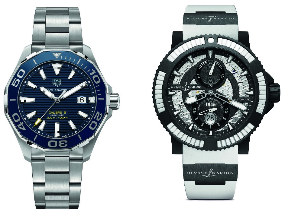 Proprio un TAG Heuer è stato Official Time Keeper al Campionato del mondo di surf 2016 con l’Aquaracers 300 M Calibre 5 automatico, cassa ø 43 mm in acciaio, lunetta in ceramica, bracciale in acciaio o cinturino in caucciù. Ulysse Nardin ha realizzato i Marine Diver anche in versione Lady, mentre nel Black Sea Diver (un cronometro con indicatore riserva di carica) ha scelto un nuovo look per il quadrante aperto nero con griglia di onde colorate, cassa ø 45,8 mm in acciaio rivestita in caucciù nero opaco, lunetta in caucciù con baguette in ceramica colorata, movimento automaitco Calibro UN-26.