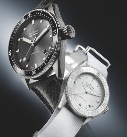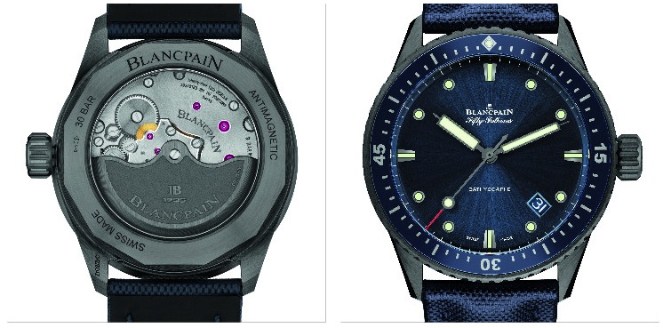 Nl 1953 nacque il Blancpain 50 Fifty Fathom, water resistant a 50 braccia; nel 2013, foto a lato, la collezione Bathyscafe è stata proposta a -300 bar; nel 2016, foto sotto, la cassa, ø 43 mm è in ceramica al plasma grigia con inserti in ceramica grigia; il quadrante è blu, il movimento calibro 1315 automatico.