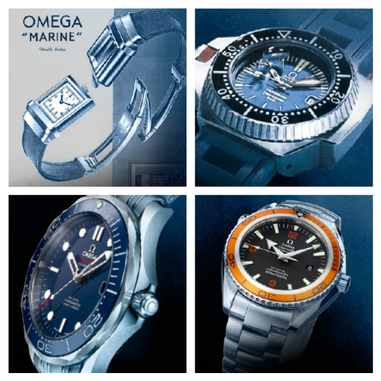 Negli anni Trenta il primo Omega water resistant fu il Marine con doppia cassa; scelto poi dal naturalista C.W.Beebe per le sue immersioni; alla fine degli anni ’50 nacque la collezione dei Seamaster; nel 1968 in collaborazione con Comex un Seamaster 300 scese a 365 m. e nel 1970 la versione 600, detta Ploprof, fu impiegata da Cousteau in molti esperimenti, mentre una ultrasottile era al braccio di Maillot che conquistò il record di immersione a m.101. Nei primi anni 90 arrivò il cronografo water resistant a m.300 e poi la collaborazione con Sir Peter B lake; nel 2005 fu lanciata la collezione Seamaster Planet Ocean e sono di quest’anno i Diver Planet Ocean 6oo M total black.