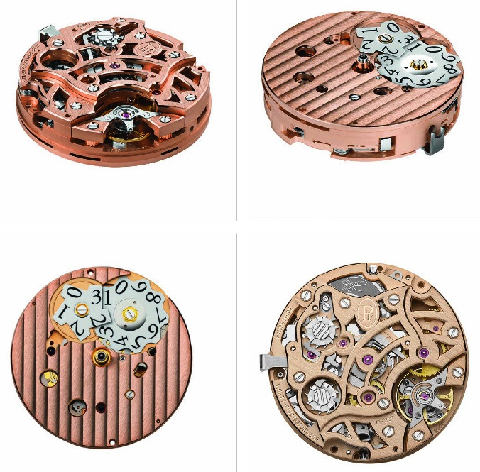 Iniziava vent’anni fa una straordinaria avventura, suggellata in pubblico da una stretta di mano, che fra gentiluomini vale più di ogni contratto, Parmigiani aveva una lunga esperienza alle spalle, prima come maestro orologiaio e riparatore di antichi tesori del MIH a La Chaux-de-Fonds e poi dal 1976 con un suo laboratorio di restauro. Tre anni più tari veniva presentato il primo orologio da polso, il Kalpa Hebdomadaire con 8 gg di carica e da piccola impresa l’azienda si apprestava a diventare il cardine di un polo orologiero che opera in diverse specialità e fornisce anche altre Maison. Oggi Parmigiani Fleurier dispone di 33 movimenti di Manifattura realizzati all’interno di questo polo. Almeno per ora il più recente è il cronografo integrato, Il movimento del Tonda Chronor rattrappante Fly-back, 36.ooo A/h, ruota a colonne, ponte passante per il bilanciere con due punti di attacco e gran data è in oro rosa per i modelli Anniversario (25 per ogni versione), cassa in oro bianco o rosa e quadranti in smalto grand fru bianco o blu (nella foto leggermente più grande degli altri perché il blu è uno dei colori che preferiamo). Sul bariletto in rilievo la firma di Michel Parmigiani circondata da fregi che rappresentano il profilo della cassa. La fibbia ha la forma dell’ansa tradizionale degli orologi Parmigiani.