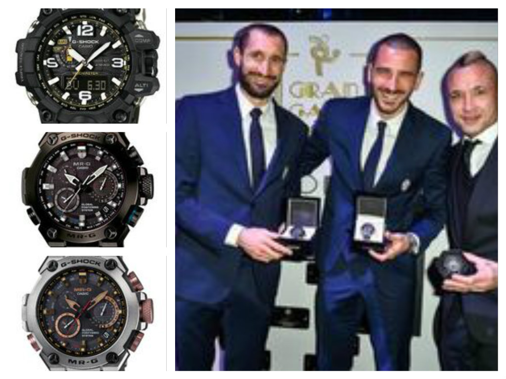 Casio sponsor della serata, ha offerto orologi G-SHOCK Premium a Giorgio Chiellini, Leonardo Bonucci e Radja Nainggolan, nella foto oltre ai premiati dall’alto in basso gli orologi GWG-1000-1A3ER, MRG-G1000B e MRG-G1000DC.