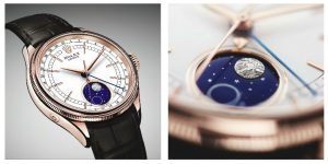 Il Cellini spesso definito come il Rolex elegante, negli ultimi anni ha assunto una connotazione ben precisa, sia sotto il profilo estetico sia sotto quello tecnico. La versione con la luna, con una cassa molto sottile in Everose ø 39 mm, ha la doppia lunetta bombata e zigrinata, un quadrante laccato bianco che si legge con grande facilità e l’indicazione analogica della data. La luna è una piccola opera d’arte: sul disco smaltato blu, quella piena è in meteorite rodiata e fa immaginare la realtà lunare, quella nuova è un semplice cerchio con le stelle decalcate argentate. Il movimento automatico è il calibro 3195 di Manifattura; la precisione cronometrica (-2+2 secondi al giorno) è due volte maggiore di quella richiesta dalla normativa per un cronometro incassato; dal 2015 Rolex ha ridefinito la certificazione di Cronometro Superlativo, scritta sul quadrante, sottoponendo gli orologi a test più severi di quelli normalmente eseguiti.
