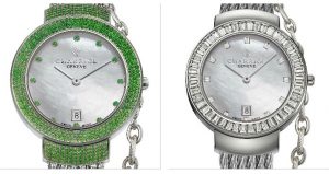 Più lussuosi i St:Tropz rotondi con la lunetta che incastona zaffiri bianchi baguette o tsavoriti; il quadrante è in madreperla con indici preziosi; il movimento al quarzo è svizzero.