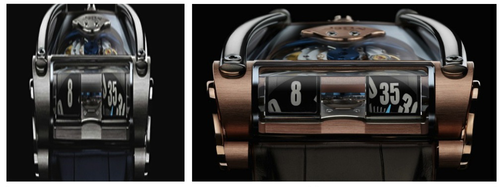 MB6F: chiudiamo con l’Horological Machine n°8 di MB&F, svelata alla fine del 2016, che si ispira alle auto della corsa automonilistica Can-Am; è il terzo esemplare MB&F dedicato con le sue forme architettoniche alla linea delle automobili del passato dopo Horological Machine 5 e HMX. La costruzione di un movimento automatico invetito, su base GP, consente di ammirare componenti normalmente invisibili dal fronte dell’orologio come ad esempio il massiccio rotore in oro 22 carati a forma di alabarda e le “barre antirollio” in titanio blu lucido; Ti-6Al-4V una lega composta da titanio, alluminio, vanadio; la cassa,che misura mm 49×51,5 è in titanio oro bianco o titanio oro rosso e grazie al vetro zaffiro che la ricopre completamente con alcune parti metallizzate, mostra da ogni posizione il movimento compostso da 247 elementi, i rubini sono 30; ore saltanti bidirezionali e minuti a scorriment, indicati su dischi orizzontali, grazie a due prismi ottici si leggono sul fronte della cassa come davanti a un cruscotto. Max Busser non manca di mettere in risalto chi ha collaborato alla realizzazione di questo modello (il cui design è di Eric Giroud) con un lungo elenco di nomi non solo per la costruzione, ma anche per la parte indiepsnabile alla diffusione dell’orologio. Infine in fatto di garanzia MB&F, quella normale di due anni, alla sua scadenza, può essere prolungata, su richiesta, per un analogo periodo.