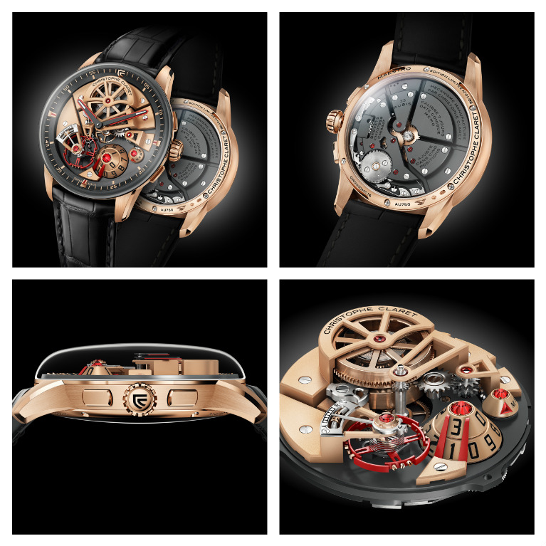 CHRISTOPHE CLARET ha presentato un nuovo Maestro con carica di 7 gg, dal vetro in zaffiro si ammira l’architettura del movimento a crica manuale con grandi ponti Charles X finemente incisi e scheletrati; la cassa galbé, ø 42 mm è la più piccola della collezione, in titanio grado 5 o in oro rosa ha un vetro zafffiro a dome che svolge la funzione della lunetta e una silhouette affascinante; il bilanciere è sato concepito in house, il sistema antichoc è dissimulato da un rubino o da uno zaffiro naturale, due i bariletti montati in serie; la gran data alle 5 fa un salto semistantaneo tra mezzanotte e mezzanotte e venti. Curiosa la funzione Memo che ruota e torna poi in posizione iniziale, per ricordare al proprietario gli impegni con un rubino o un diamante e un sistema di salto semistantaneo. Le due versioni sono limitate a 88 esemplari e il loro prezzo, non certo sostenibile da tutti, è prò inferiore a ciò che si potrebbe pensare in un orologio di qusto tipo.