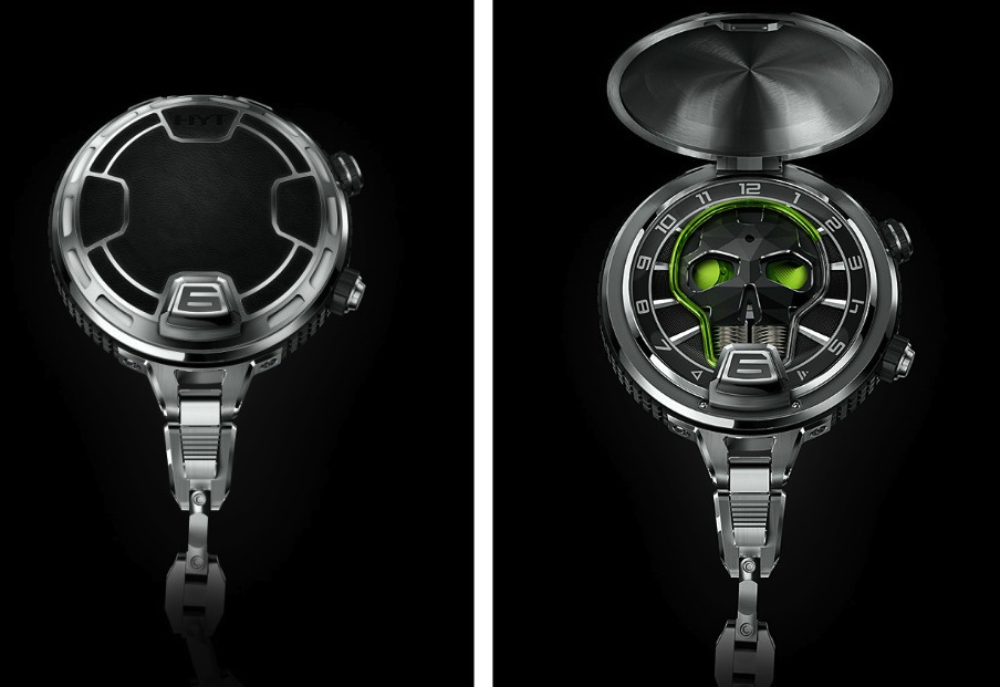 HYT affianca l’avanguardia in un modello del passato che sembra stia tornando di moda sebbene in modo limitato, parliamo dell’orologio da tasca. Lo Skull in questione è realizzato in otto esemplari. Nel modello che abbina, come nelle versioni da polso, meccanica e fluidi, la cassa in titanio e titanio DLC nero ø 59 mm, nella quale le anse sono state ridimensionate a favore della leggerezza, ha il fondello metallizzato a vite; il coperchio, che presenta una decorazione, nasconde il quadrante nero decorato a clous de Paris; si apre premendo un cavaliere tecnico a ore 6 e svela il teschio che prende la colorazione verde dai due lati del cavaliere; l’ora si legge a retrograde intorno al teschio, i secondi appaiono dall’occhio sinistro la riserva di carica in quello destro. Il movimento a carica manuale è il Calibro HYT, A/h 28.000, 35 rubini. Il modulo meccanico luminescente carica e supporta il sistema con la corona alle 4,30, quando la si preme si attiva il sistema di dinamo, rilasciandola la luce si spegne. Il modello è completato da una catena in titanio.