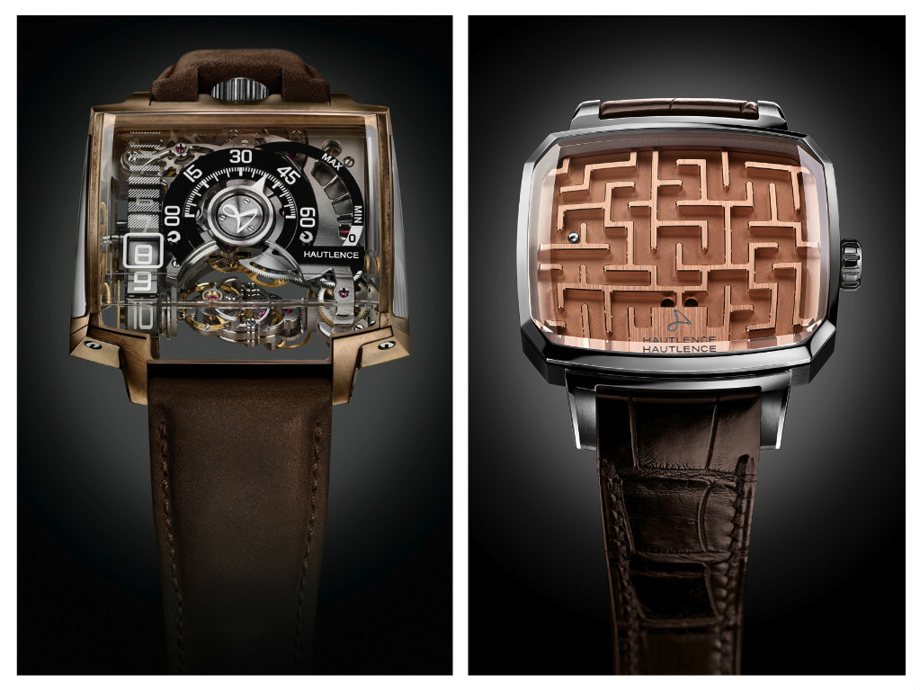 HAUTLENCE – abbiamo già scritto dei Vortex, quest’anno ne è stato presentato uno con la cassa in bronzo che si adegua alle tendenze più attuali. La quarta versione di questo segnatemo automatico unisce tradizione e futuro, il movimento, protetto da tre brevetti, è visibile attraverso i sei vetri zaffiro; il meccanismo delle ore dipende da una catena, i minuti sono indicati a retrograde e c’è l’indicazione della riserva di carica; la gabbia dell’organo regolatore ruota a 60° su se stessa ogni 60 minuti evitando gli scarti di precisione dovuti alla gravità. Curioso il Labyrinthe che ci ha fatto tornare in mente un Corum automatico disegnato nel 1991 da un italiano, il maestro Ventrella, che aveva riprodotto il famoso labirinto di Creta inserendo sul quadrante, dotato di lancette, una minuscola sfera. Il Labyrinthe di Sandro Reginelli invece non indica l’ora, è paragonabile agli objets de virtus del passato o forse a un flipper; un gioco di camme visibile dal quadrante d’oro mette in circolazione una sfera in platino che porta a un gioco di destrezza.
