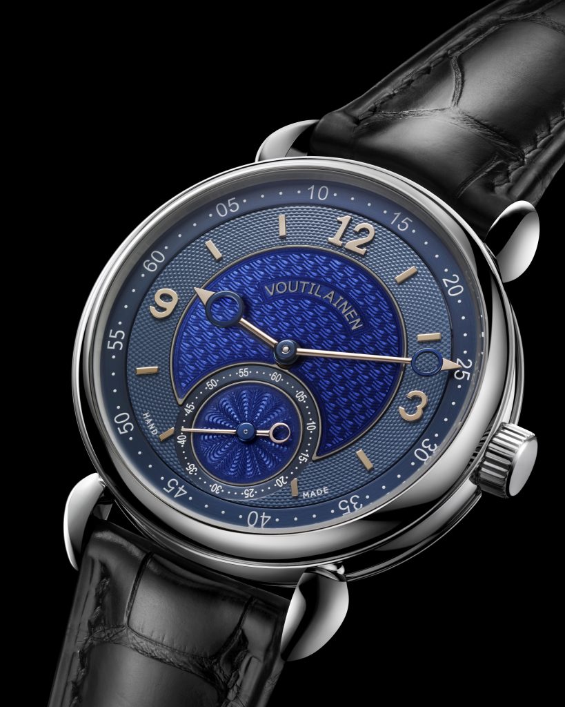 KARL VOUTILAINEN – con il Vingt-8 ISO si entra nella filosofia del tempo. Generalmente basta uno squardo al quadrante per conoscere l’ora, ma non su questo orologio davvero particolare. A ogni ora le due lancette si sovrappongono, invece alla mezz’ora si presentano opposte; il disco dei minuti ruota seguendo il ritmo della lancetta delle ore; l’ampiezza dell’angolo fra le due lancette resta sempre uguale e la posizione dell’una rispetto all’altra è sempre la stessa, rispetto ai minuti, qualsiasi sia l’ora rappresentata. Il movimento, ideato e realizzato in house, presenta componenti inediti come lo scappamento che, con due ruote d’oro e a impulso diretto, necessita di minor energia di quello con l’ancora tradizionale; il bilanciere, ø 13,60 mm, ha la spirale con la curva esterna Philips mentre l’interna impiega la curva di Grossmann; i rubini sono 21, le A/h 18.000; la cassa ø 39 mm e la corona sono in oro.