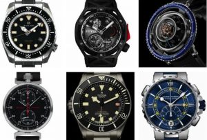 Seiko Grand Seiko con il bracciale e la cassa in titanio levigato ø 46,0 è il primo Plongeur automatico della Marca giapponese w.r. a 600 m.; il movimento è il Calibro Hi-Beat 9S, A/h 36.000, la precisione garantita da -3 a +5 secondi al giorno. Grazie alla costruzione innovaiva ideata da Seiko non esiste la valvola per l’elio, la lunetta puà essere azionata facilmente anche con i guanti, il quadrante in ferro dolce protegge il movimento degli effetti del magnetismo sino a16.000 A/m. Hublot il Techframe Ferrari 70 Years Tourbillon Chronographe, realizzato in occasione del 70° anniversario della Ferrari, apre un nuovo capitolo nella collaborazione fra la Marca modenese e quella elvetica. La qualifica di orologio sportivo gli va stretta, a prescindere dal fatto che inaugura una nuova collezione destinata a un ristretto numero di facoltosi appassionati. Tre le versioni di questo modello disegnato sotto la guida di Flavio Manzoni, respnsabile del reparto Design Ferrari ed elaborato e realizzato da Hublot con la cassa ø 45 mm (la corona a ore 4 ne riduce la dimensione) in King Gold, in Carbonio Peek o in titanio, ognuna realizzata in 70 esemplari e che consente di cambiare rapidamente il cinturino. Oltre alla corona con insrto in titanio PVD e il celebre cavallino rampante, ci sono altri dettagli colorati che collegano il segnatempo alle automobili, i pulsanti laterali sono nel famoso rosso P485 Ferrari, l’incisione sul fondello “Limited Edition, NoXX/70” è in nero e sul vetro zaffiro si legge “Ferrari 70 Years” . Il movimento di Manifattura è il Calibro HUB6311 a carica manuale con 5 giorni di riserva di carica, cronografia monopulsante con ruota a colonne all’una che dipone di una inedita leva in alluminio rosso Ferrari, scappamento a tourbillon visibile dal lato quadrante, con un componente in zaffiro che consente al tourbillon volant di avere la stabilità di un normale tourbillon con due punti di attacco. MB&F horological machine n°7 Aquapode ø 53,8 movimento automatico con scappamento a tourbillon volant centrale e rotore in titanio dotato di tentacoli per alimentarsi di energia La costruzione verticale concentrica e il disegno dei contatori si riallacciano all ‘immagine di una medusa e delle onde del mare. e ricordano le meduse anche gli anelli radiali simmetrici concentrici luminosi per indicare ore e minuti. Infine la lunetta in ceramica sembra fluttuare al di sopra ella cassa. Montblanc Time Walker Chronograph RallyTimer si ispira alle costruzioni ideate da Minerva, celebre per i suoi cronografi; e in particolare al Rally Timer. la cassa è in titanio grado 2, ø 50 mm; l’orologio è prodotto in l’edizione limitata (100 gli esemplari). La costruzione consente di trasfomarlo da orologio da polso in uno da tasca e anche da tavolo (sul fondo della cassa due appoggi lo sostengono), basta far ruotare la cassa di 180°. Il movimento è il Calibro di Manifattura MB M16.29 monopulsante a carica manuale, il ponte del cronografo a forma di V fu brevettato nel 1912. Il bilanciere ha 18.000 A/h Accurati test di laboratorio confermano un utilizzo reale e continuativo di oltre 500 ore.. Tudor Pelagos LHD (Left Hand Drive) ø 42 mm movimento automatico di Manifattura Calibro MT5612 (la sigla MT significa Movimento Tudor), 28.800 A/h, bilanciere a inerzia variabile con spirale in silicio, 70 ore di carica, ha la cassa w.r. a 500 m con valvola per l’elio, con la corona a sinistra come accaduto in altri modelli passato aderendo alle richieste di subacquei professionisti. Per la prima volta Tudor realizza un’edizione numerata con incisione sul fondo. Sul quadrante beige il nome è in rosso a ore 6 mentre il datario ha in nero i giorni dispari e in rosso quelli pari, particolarità che alla fine degli anni ‘60 fece definire questo quadrante “roulette”. La lunetta girevole unidirezionale è in ceramica con dettagli beige per uniformarsi al quadrante. Infine ha ili certificato COSC di cronometro, bracciale in titanio con fibbia allungabile brevettata o in caucciù. Ulysse Nardin Marine Regatta cronografo rattrappente con la cassa in acciaio ø 44 mm w.r m.100, dotato di count-down con un invertitore oggetto di brevetto (studiato con i tecnici dell’Artemis Racing – UN è stato official timekeeper di Artenis nella 35 coppa Amerca – per i dieci minuti regolamentari prima della partenza della gara) che poi riparte in senso orario per cronometrare il tempo della regata. Il movimento Calibro UN 155, parte dall’UN153 che si è evoluto, riserva di carica 3 giorni, stop secondi e cambio di data bidirezionale. Quadrant e blu oceano o bianco, In omaggio alla partenship con Artemis è stata realizzata anche una serie limitata di 35 esemplari con quadrante nero in smalto.