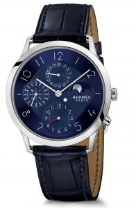 Inserito nella collezione Slim, d’Hermès anche un orologio molto classico, il nuovo Calendario Perpetuo automatico (con micromotore) fasi di luna e secondo fuso orario.