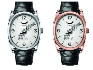 È un segnatempo esclusivo l’Ovale Pantographe (50 esemplari numerati) che riprende, su un modello da polso, una particolarità che aveva stupito Michel Parmigiani, quando la vide in un Tasca del 1780 (lancette telescopiche che si allungano e si accorciano grazie a due sonde in una camma che ne orchestrano il movimento), A prescindere dal Calibro (un carica manuale autonomia di 8 giorni) realizzato in house in oro rosa 18 carati, difficile da lavorare per la sua duttilità, e dalla lavorazione a grain-d’orge del quadrante, sono proprio le lancette (sollecitate anche dai numerosi movimenti del polso) ad essere coinvolte nel loro percorso costante. Occorreva trovare il giusto rapporto fra il peso (i componenti sono 30) e l’elasticità richiesta e i tecnici di Fleurier per garantire equilibrio del dispositivo e affidabilità dell’orologio, hanno individuato la risposta in una lega di alluminio a base di magnesio, impiegata nell’industria automobilistica.