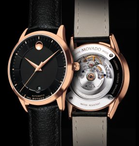 Il Calendomatic, nel 1945, fu il primo automatico di Movado. Nel 2015 sono tornati movimenti meccanici nella collezione 1881 Automatic e quest’anno ne è stata presentata una nuova versione con movimento ET 2824-2 visibile dal fondo e cassa in acciaio o PVD oro rosa ø 39,5; quadrante nero a raggi di sole e l’iconico design con il punto dorato alle 12.