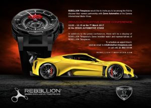 Nello scorso gennaio Rebellion ha presentato le novità 2017 nello spazio Barton, al Salone ginevrino sarà presente nello stand Zenvo Automotive dove il 7 marzo è prevista una conferenza stampa. A Baselworld,invece, lasciato il Palace, la Marca d orologi è nella Halle 1.2.
