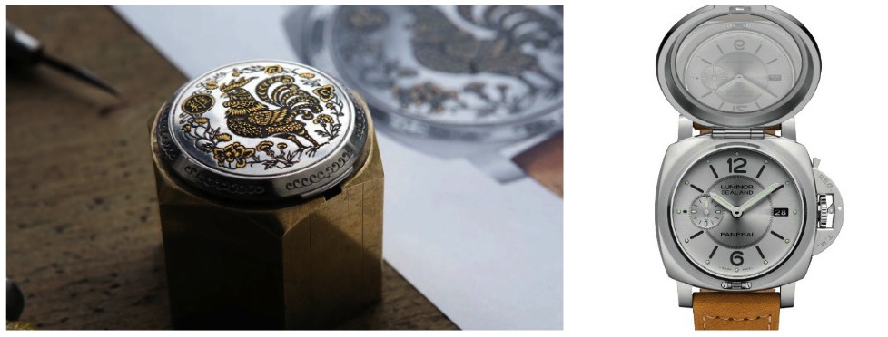 Nella collezione Luminor 1950 Sraland 44 mm sul coperchio, che cela il quadrante, si ammira l’incisione di un gallo.