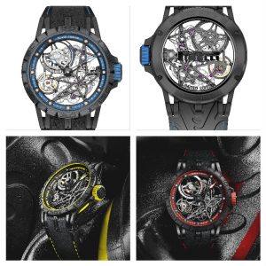 A partnership between Pirelli and Roger Dubuis with 3 skeleton Excalibur Spider self winding limited and numbered edition (88 watches) and 8 Excalibur Spider skeleton double tourbillon volant.