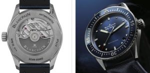 In questo automatico in acciaio ø 38 mm, ciò che colpisce è la scelta cromatica del quadrante e dell’inserto in ceramica sulla lunetta unidirezionale con indici in Liquidmetal®, la tonalità del blu fa pensare ai fondali del mare. Analizzando l’orologio sotto il profilo tecnico va messo in risalto che ha un movimento automatico, il Calibro 1150, composto da 210 elementi e grazie ai due bariletti montati in serie ha una riserva di carica di 100 ore; la spirale è in silicio, materiale non solo leggero e resistente, ma anche antimagnetico. Il fondello in vetro zaffiro consente di vedere il movimento e di ammirarne la massa oscillante in oro (lavorata in modo da comporre in rilievo il logo Blancpain) e rivestita di NAC una lega di platino.