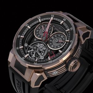 REBELLION – A prescindere dal disegno dell’invito, che lascia aperte molte supposizioni, interessante è il Predator 2.0 regulateur con scappamento a tourbillon, realizzato in tiratura limitata a 30 esemplari, unendo appunto l due complicazioni: indicazione del tempo come regulateur e scappamento a tourbillon, cassa (che si può scegliere) in titanio, black DLC, oro rosa, carbonio ø 48 mm. Movimento automatico esclusivo, tourbillon, su base Telos Watch P351, A/h 28.800, decorazione particolare.