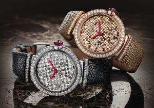Among art-watchmaking there are mosaique dials, Bvlgari has made them for Lucea collection with gold square tiles sparkling like sun. Self-winding movement, case in white or pink gold with diamonds.