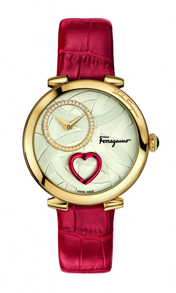 Time for Love con un cuore rosso bn in vista che pulsa sul quadrante del S.Valentino di Ferragamo Timepieces, che ha ideato e brevettato la funzione che separa e riunisce le due metà del cuore premendo la corona. La rimessa all’ora avviene con il pulsante a ore 2 anch’esso a forma di cuore. Cassa rotonda in acciaio trattata IPG yellow gold, ø 39 mm, indicazione decentrata di ore e minuti sul quadrante con il fondo texture Gancino, cinturino rosso. Il modello è in vendita anche online su ferragamotimepieces.com.
