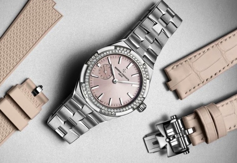 La collezione Overseas in acciaio è la più sportiva della Marca ginevrina e il Petit Modèle qesr’anno assume un delizioso aspetto cromatico che esalta la femminilità dell’orologio in acciaio, ø 37 mm, con fondo trasparente impreziosito da 84 diamanti per oltre un carato; il quadrante è beige, ma esiste anche blu o chocolat. movimento Calibro di Manifattura Calibro 5300 a carica automatica con massa oscillante in oro 22 carati decorata con la rosa dei venti. Bello il bracciale con le maglie che formano il simbolo della Maison, la croce di Malta, con superfici lucide e satinate, che si può cambiare rapidamente con il cinturino in pelle variando così l’aspetto dell’orologio. Nella collezione sono presenti anche orologi in oro rosa, tutti con il Punzone di Ginevra.
