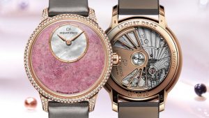 I quadranti in pietra fanno parte del DNA della Marca di La Chaux-de-Fonds. L’Heure Petite Minute con diamanti è stato realizzato proprio con un quadrante in astorite sul quale si intravedono minuscole inclusioni d’oro e d’argento a contorno dell’indicazione del trascorrere del tempo sul quadrante decentrato in madreperla bianca. Il movimento è automatico e ha con componenti in silicio. La cassa in oro rosso ø 35 mm è impreziosita con 232 diamanti, gli esemplari sono 28. Il nome “astorite” deriva dalla pietra estratta da una miniera che apparteneva a un facoltoso uomo d’affari, Mr.Astor, scomparso nella tragedia del Titanic.