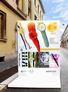 A poster in Montenapoleone (till April 13th Time to Art, free exhibition at number 25), new watches for 35° Anniversary to buy in Swatch boutique and other Swatch ideas shown on social.
