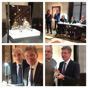 Il tasca in pole position, la direttrice del museo e il tavolo degli oratori, Fabio Bertini e Michel Parmigiani, Michel con l’orologio e uno dei molti appassionati presenti