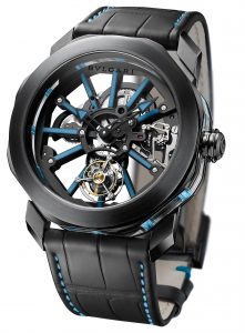 E per concludere un orologio eccezionale, l’Octo Tourbillon Sapphire in nero e acciaio trattato DLC con contrasti blu, quadrante openworked e fondo trasparente, movimento manuale Calibro BVL 206 con undici ponti in DLC ornati di barre blu in ITR2; un nuovo materiali; per regolare l’ora si preme la corona e appare una minifinestrella rossa a ore 3, compiuta la regolazione un’altra pressione la fa scomparire. Il movimento scheletrato si inserisce perfettamente nella cassa dell’Octo che ne accentua i punti salienti. Un orologio, sicuramente elitario, che dimostra la creatività della Marca.