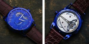 Però dopo la presentazione dei 12 esemplari nella collezione DB25 Imperial Fountains arriva anche la Maestri’ Art Collection ideata per pochi intenditori appassionati. Denis Flageollet uno dei fondatori del Marchio, ha ceduto al fascino dell’arte asiatica realizzando due pezzi unici, uno secondo un’antica arte giapponese dell’incisione su metallo, utilizzata un tempo per le protezioni dalle sciabole, l’altro unisce il savoir-faire orologiero ai materiali più attuali come per esempio il titanio, da sempre campo di ricerche da parte di De Bethune che qui lo impiega azzurrato e sul quadrante pone indici in diamanti.