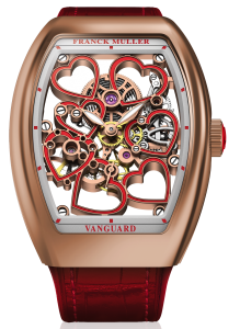 On last January Fanck Muller made a special skeleton Vanguard where heart are in pole position, mechanical movement and a small rose gold case for ladies.
