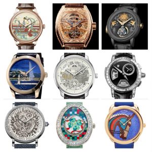 Invero gli orologi gioiello a volte presentano aspetti molto simili a quelli che determinano i modelli dei Mestieri d’arte perché con le pietre preziose stilisti e maestri gioiellieri sanno creare dei capolavori spesso esclusivi; qui abbiamo messo al centro il preziosissimo Trillion Tourbillon of Tourbillon di Antoine Preziuso in oro bianco e un diluvio di diamanti che per la loro incastonatura hanno riflessi incredibili, tre grandi solitaires ruotano sul quadrante dove affascinano i tre scappamenti a tourbillon. Questo esemplare unico, è realizzato da Antoine e da suo figlio Florian (entrambi vincitori nel GPGH del 2017), lo circondano a sinistra dall’alto in basso: Corum Golden Bridge; Bvlgari Wild Pop Serpenti high jewellery: Chanel: Bouton de Camelia; De Grisogono Cascata; Girard-Perregaux Cat’s Eye jewellery. A destra invece Moritz Grossmann Tenus 1000 e una notte, Piaget Montre manchette dentelle; TAG Heuer Connected modular diamonds; Van Cleef&Arpels Secret de coccinelle; Gibert Niura. C’è di che restare a bocca aperta per l’abilità dei maestri gioiellieri sia nella scelta delle pietre sia nella loro incastonatura.